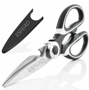 - Quality assurance: The fifth generation of new gravity kitchen scissors,Japan SK5 stainless steelļ¼ multiple functions, non-slip and durable; micro-serrated edge, high-grade rivets, more solid and durable.