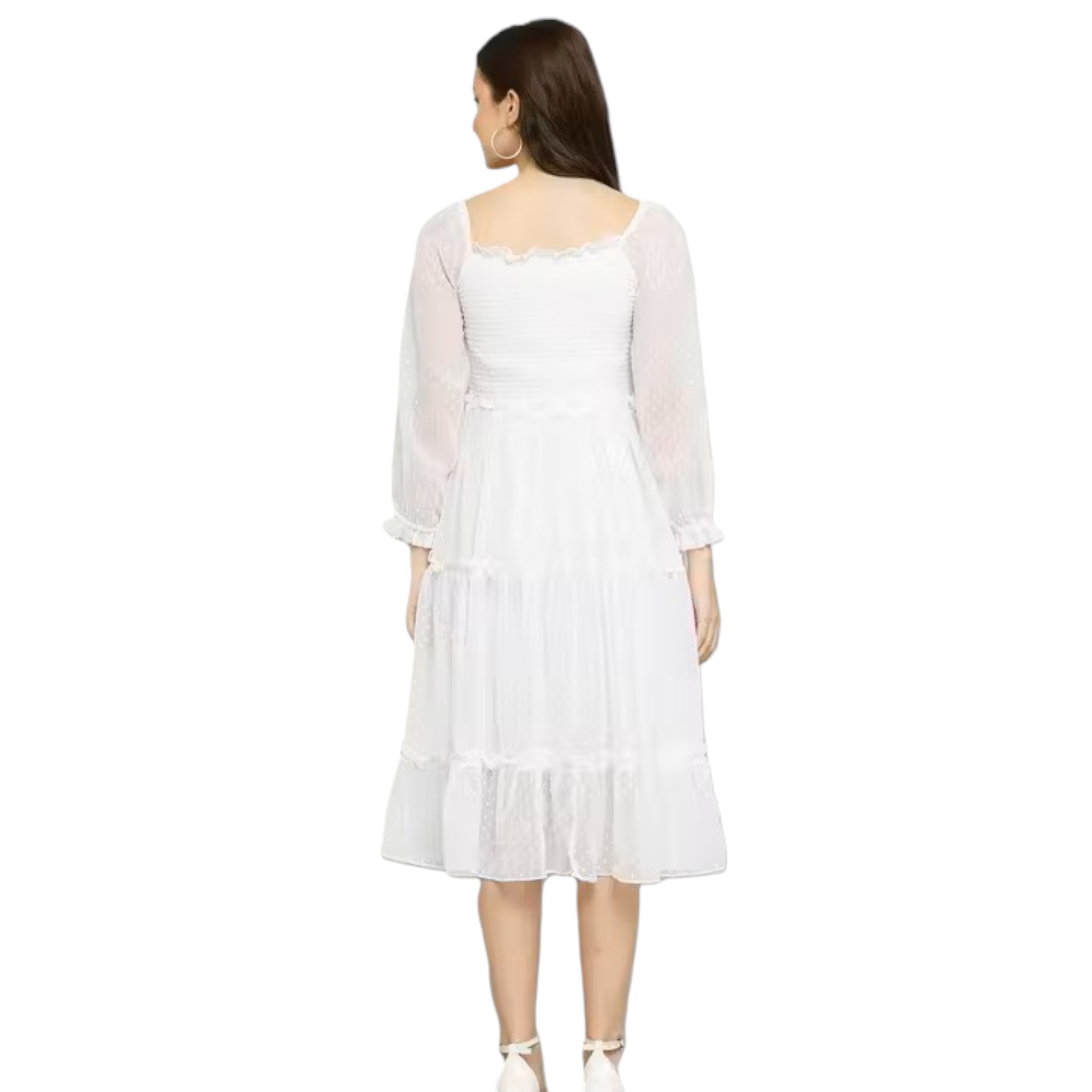 Women’s White Western A-Line Midi Dress with Sheer Puff Sleeves & Smocked Bodice